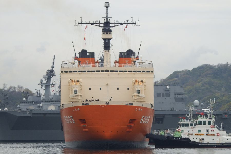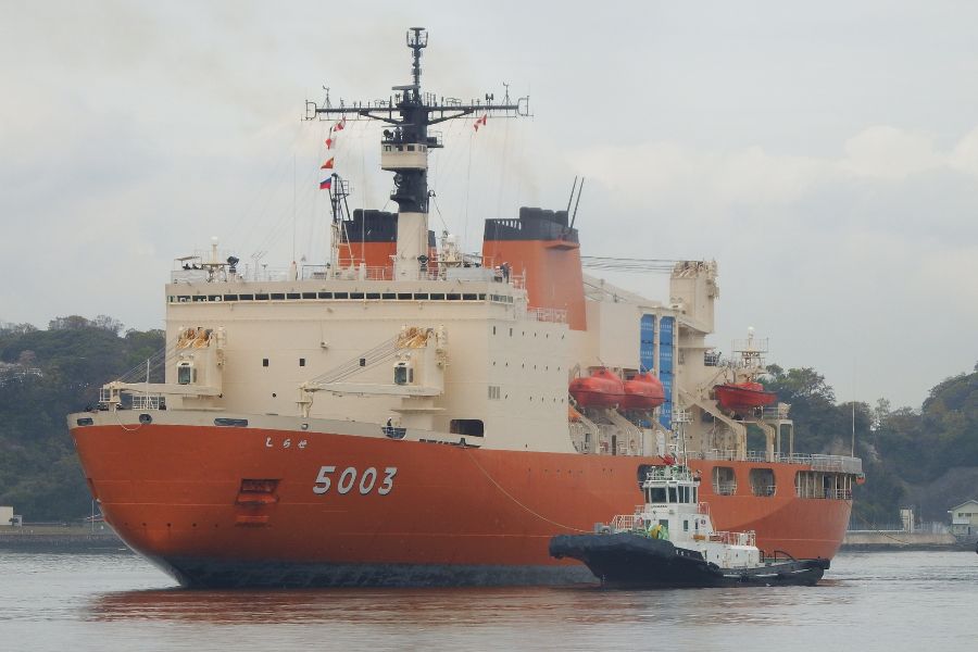 タグボートが引っ張っているからかどうかは不明ですが、「しらせ」船体が心なしか左舷側に傾いている感じがします。