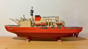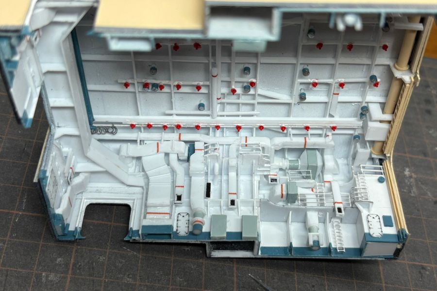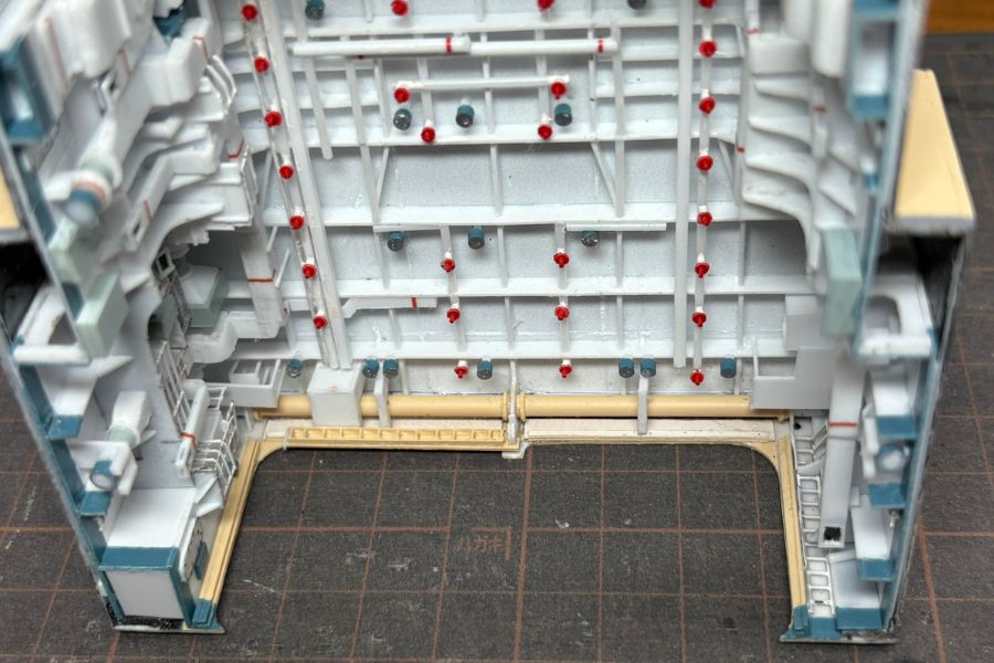 格納庫内部、右舷側の様子です。格納庫内部の図面は描いてないため、自分で撮影した多数の画像を参考にしながら製作しています。