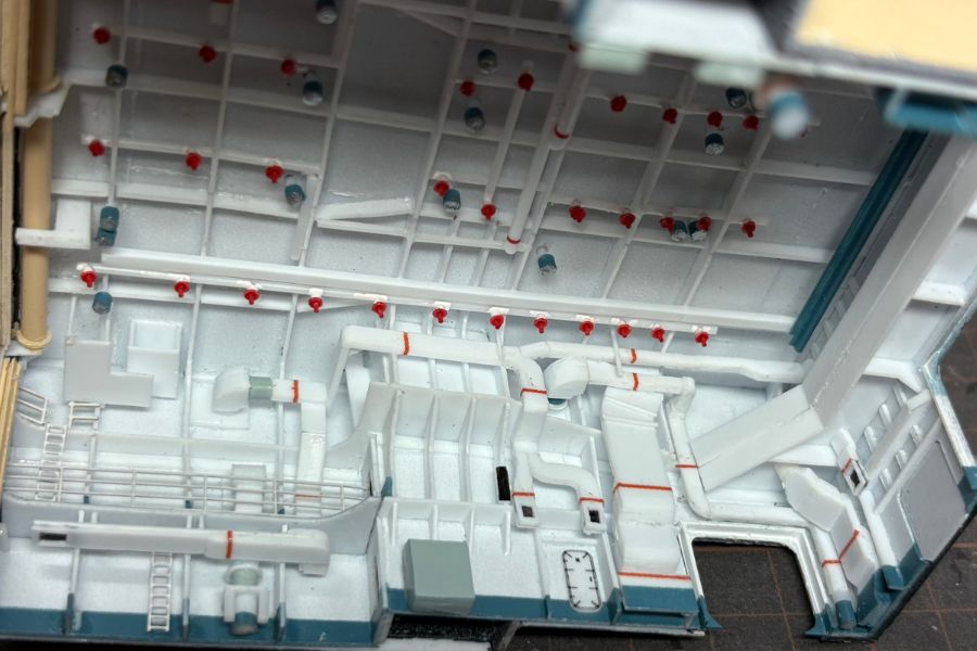 天井には多数の照明や消火ノズルがあります。本来の縮尺率で製作するには小さすぎ、かといって省略すると物足りなくなるので若干大きめのサイズで作り込んでいます。