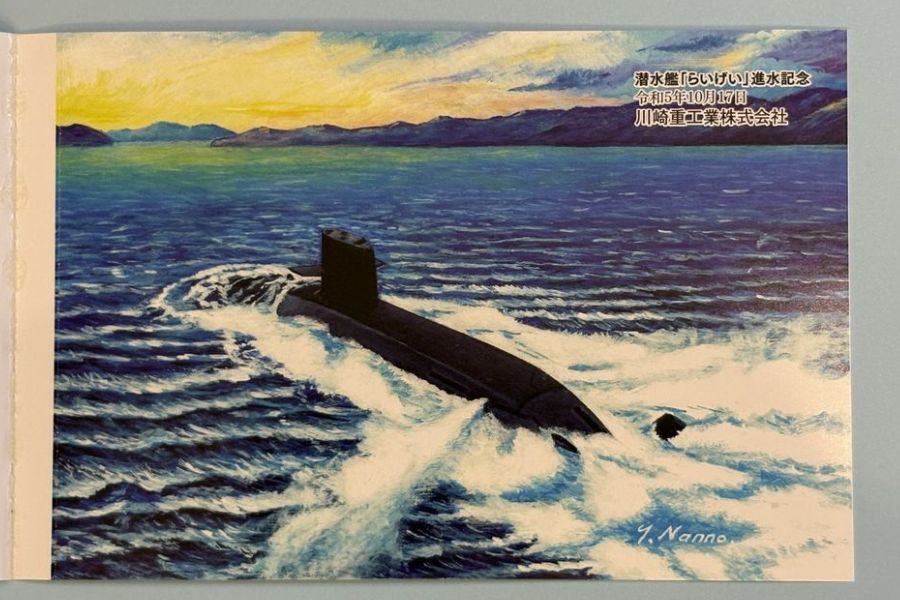 潜水艦「らいげい」進水記念絵はがきの表紙を開いた中の艦影です。最近はデジタル画が多くなり、絵画調の絵はがきは貴重になりつつあります。