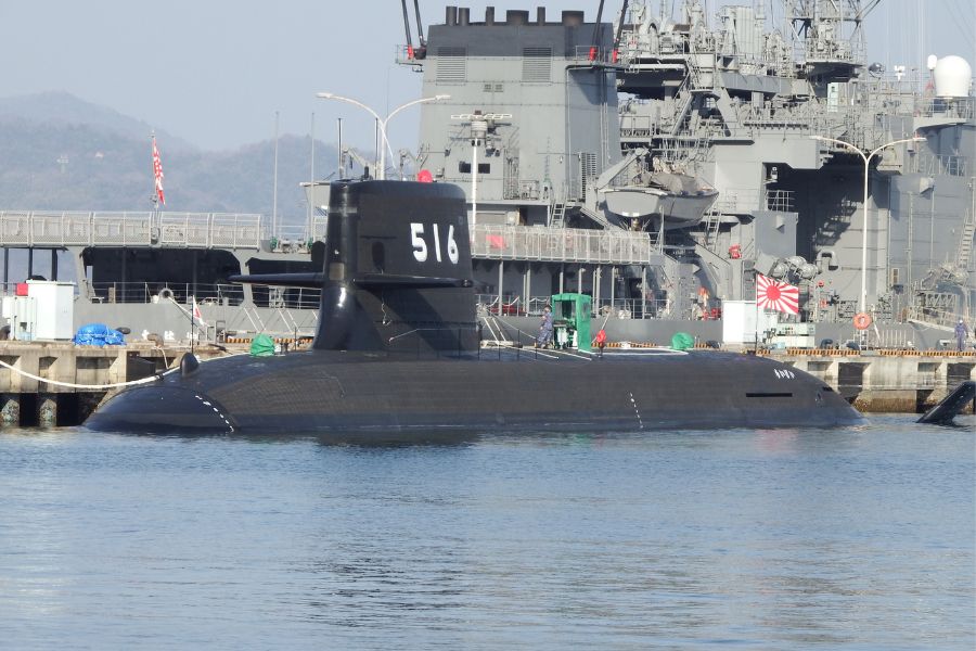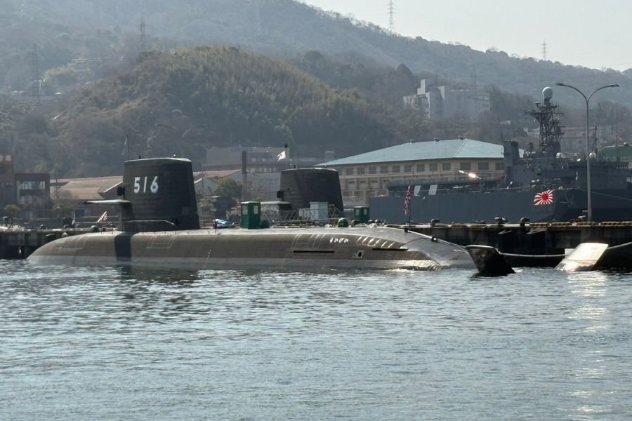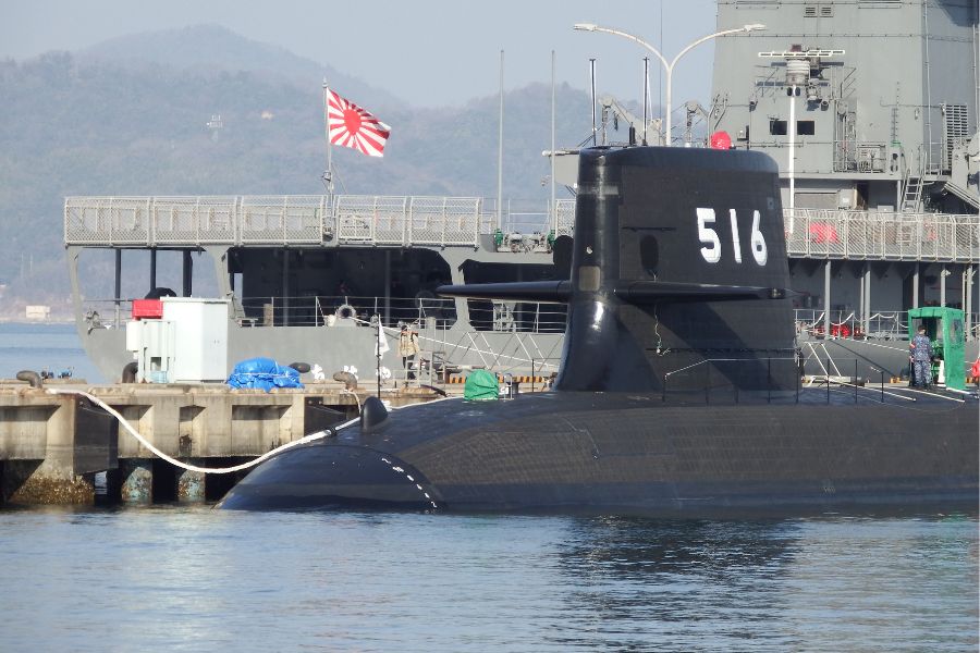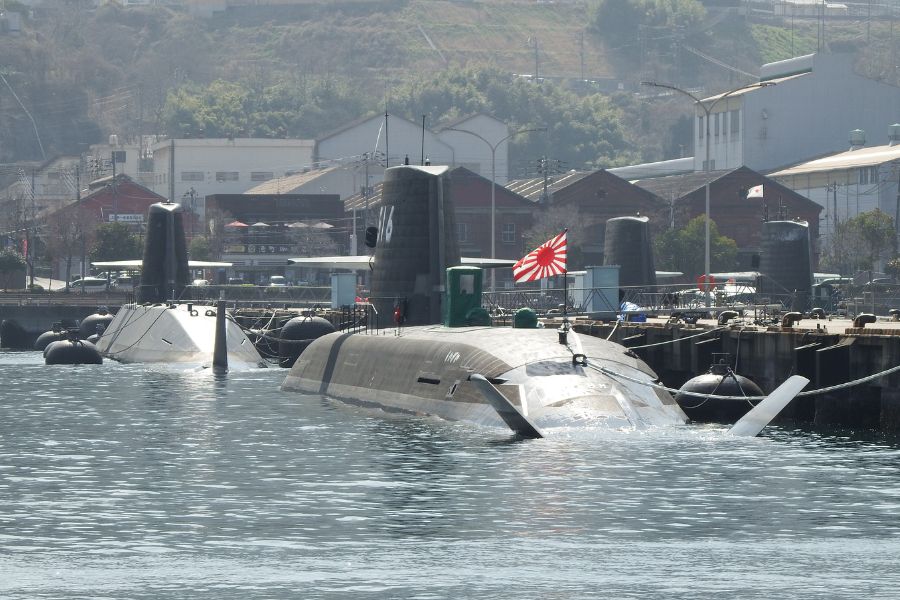 潜水艦のセイルが4つ見える中で右から2隻目は、2023年3月17日に退役した練習潜水艦「おやしお」です。退役当時から同じ場所に係留されていますが、現役艦と間違えるくらい船体が綺麗です。