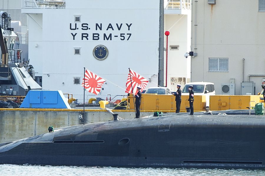 2隻の潜水艦が接岸しており、2つの自衛艦旗がきれいになびいています。