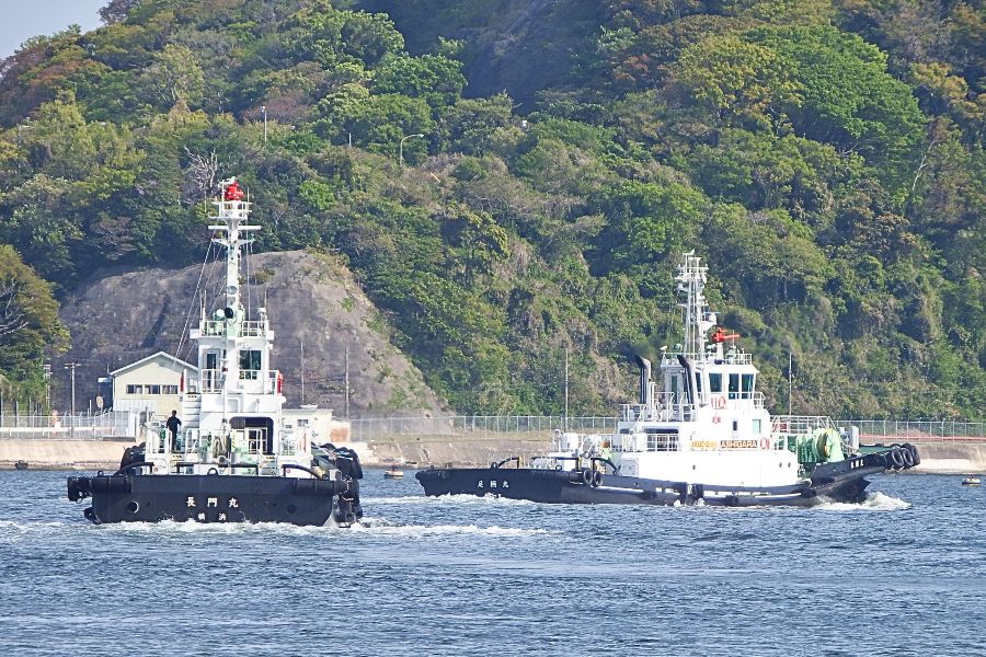 「しらせ」の艦首側を押しているタグボートは「長門丸」でした。