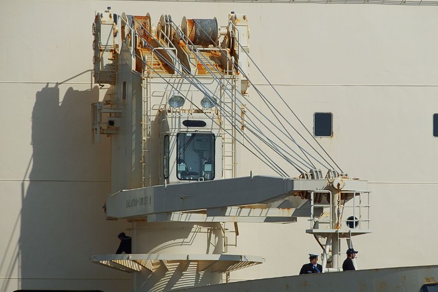 「しらせ」艦首の右舷デッキクレーンです。錆の浮き出た様子が任務の過酷さを物語っているようでした。