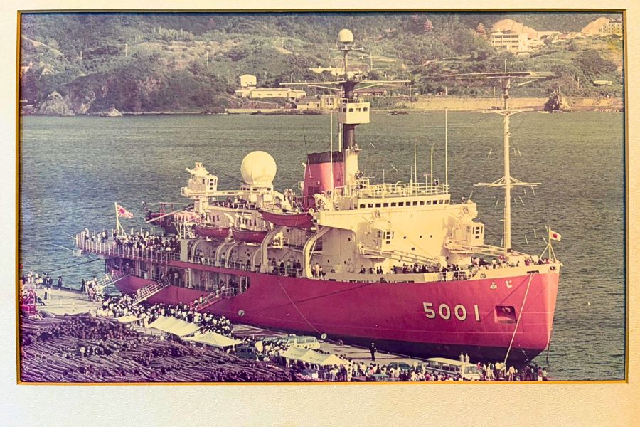 この撮影アングルの「しらせ」で思い出したものがあります。今から50年前、1975年(昭和50年)10月、浜田商港に寄港した砕氷艦「ふじ」の写真です。額入りでどうしても欲しかったので親にせがんで購入してもらい、色は褪せてしまいましたが、今も大切に飾っています。