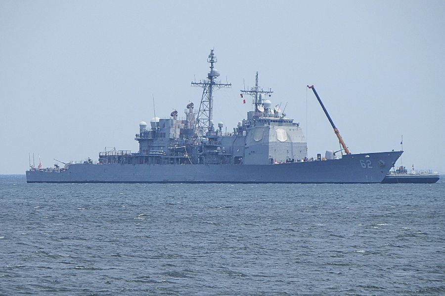 横須賀港外にタイコンデロガ級ミサイル巡洋艦「ロバート・スモールズ」 (USS Robert Smalls, CG-62)が停泊しており、クレーンを載せた台船が接舷し作業している様子でした。同艦は2年前に「チャンセラーズビル」(USS Chancellorsville)から改名されました。