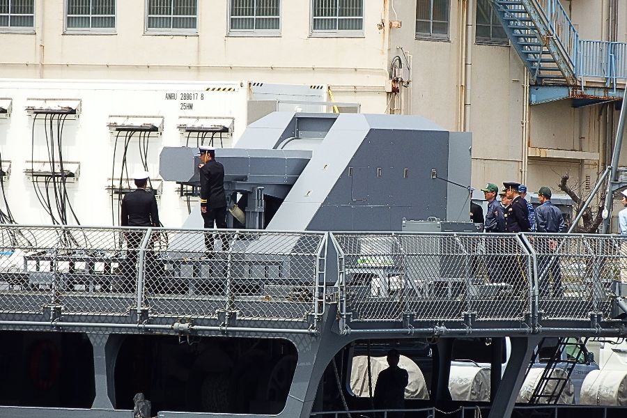 長浦港へ進み最初に目に入って来たのが試験艦「あすか」でした。後甲板に白いコンテナがたくさん積まれており、その後方には、現在海上試験中と言われている「レールガン」が見えました。