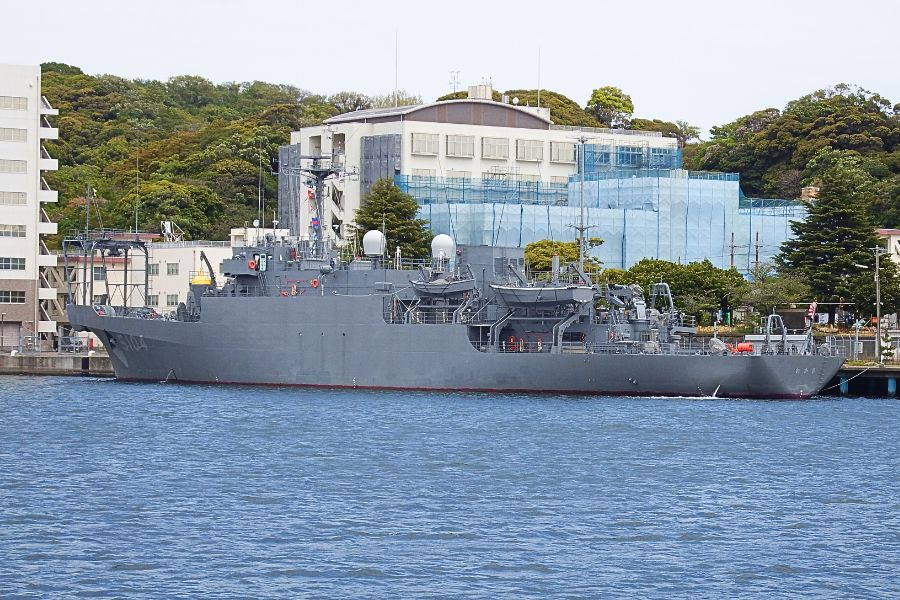 海洋観測艦「わかさ」です。ネームシップの1番艦「ふたみ」がリタイアして15年になりますが、「ふたみ」就役から7年後に就役した「わかさ」は各部の性能向上が図られているといい、もう少し一線にいるのでしょうか。