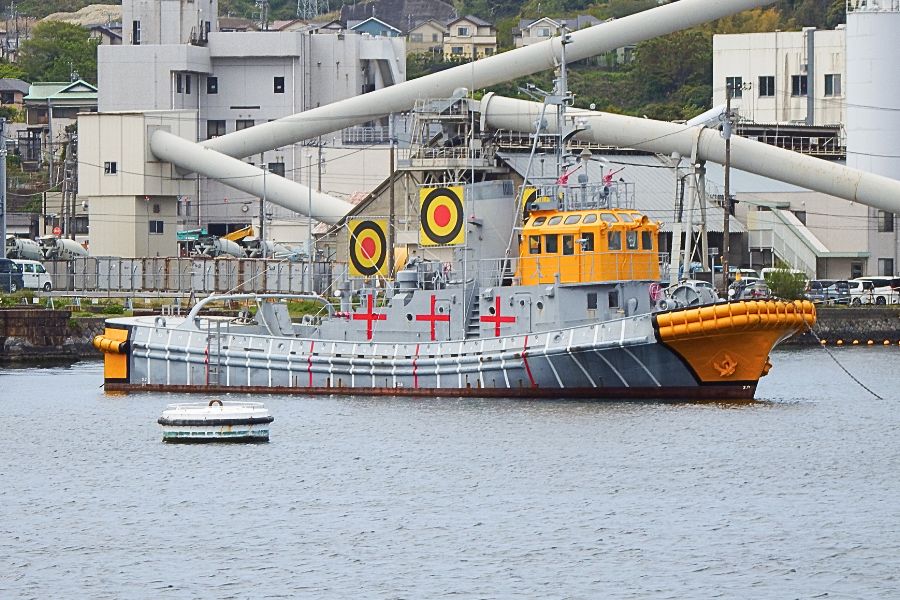 カラフルな船影が目に入って来ました。リタイアした旧曳船68号で、標的船としての塗装と標的シートが張られています。その下の画像は1年前に撮影したものです。