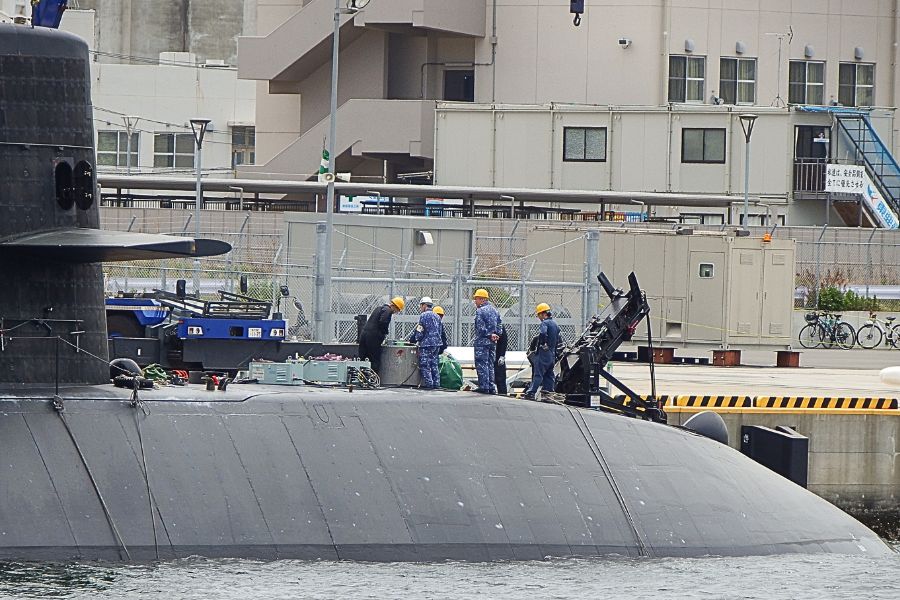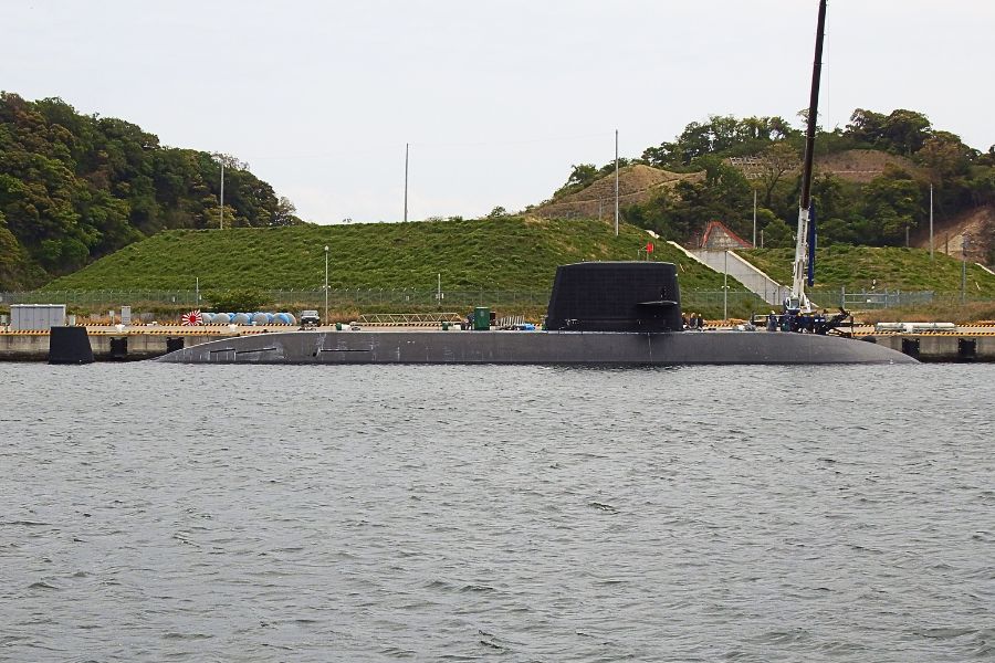対岸に”おやしお”型潜水艦がいました。「うずしお」もしくは「やえしお」と推察されます。艦首では魚雷の搭載作業をしているようです。
