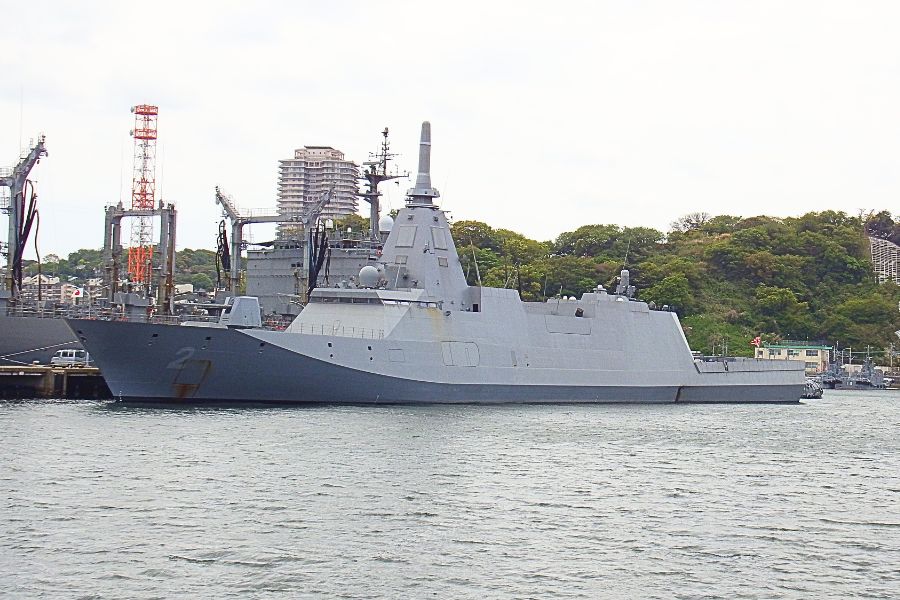 水路を通って再び元の港内に戻ると護衛艦「くまの」(FFM-2)が停泊していました。昨年はここにネームシップの「もがみ」がいました。艦橋上の通称「ムンクの叫び」をアップで撮影しようとピントを合わせるとほぼ真下を向いており、頭のてっぺんが見えていました。