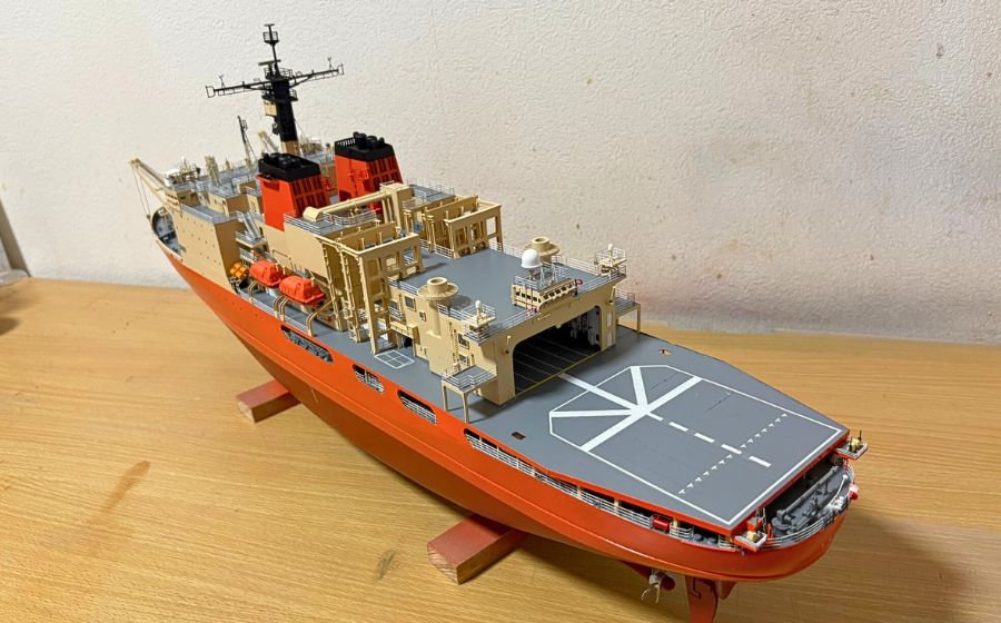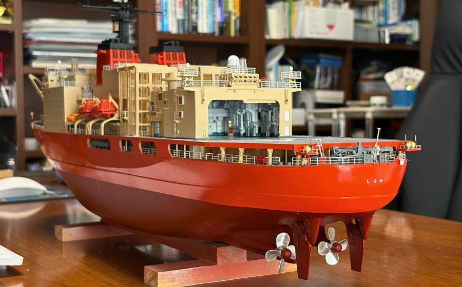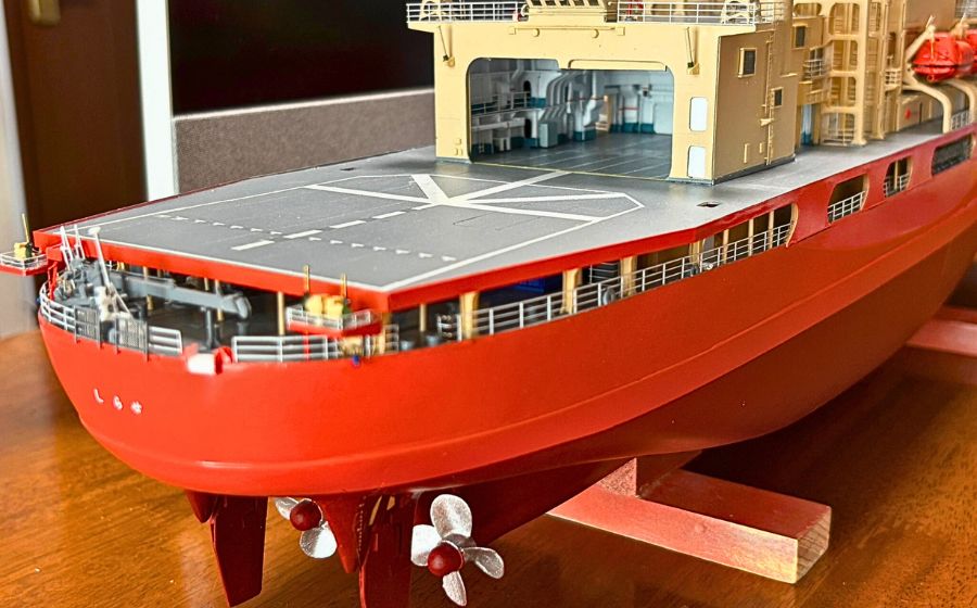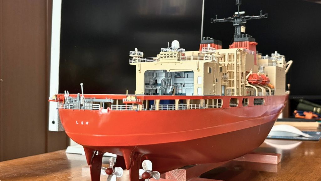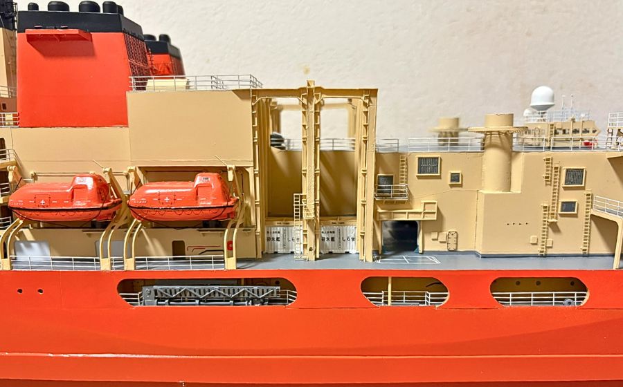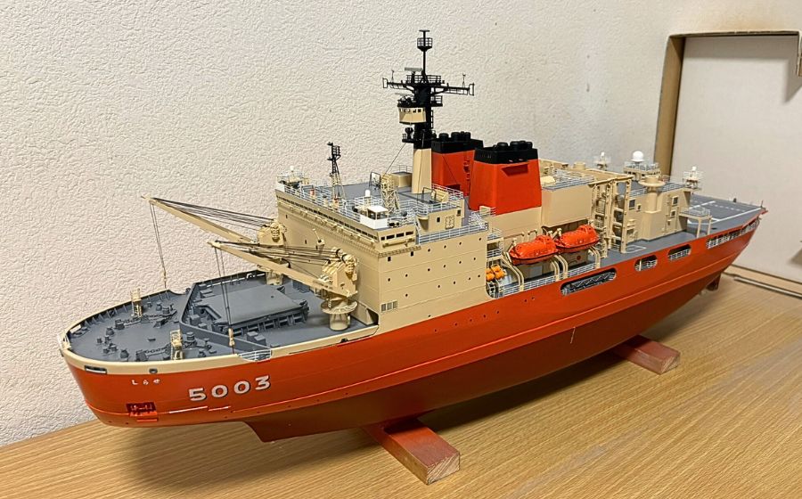 この4作目は2023年9月、「しらせ」が浜田に寄港したときの状態で製作しています。寄港当時はヘリコプターが不在だったので搭載予定はありませんが、ヘリの模型は製作在庫があるので、気が向いたら載せてみたいと思います。