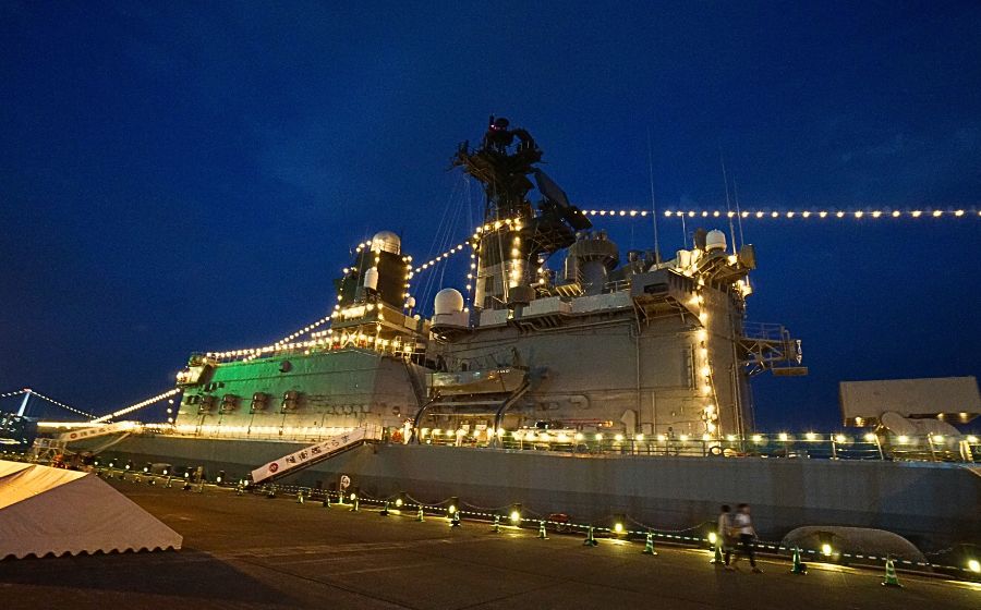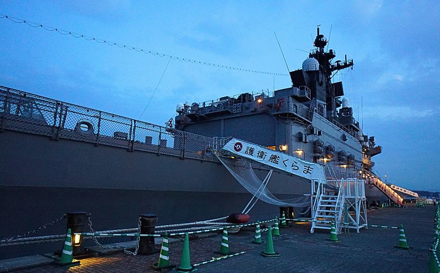 午後7時30分頃の撮影です。艦内の電灯が点灯されています。