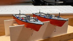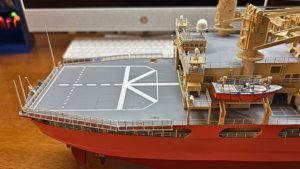 後部デッキクレーンを製作し取り付けを完了しました。ブログ用の画像を撮影していたところ、右舷クレーンのワイヤーの張り方を一部誤っていたことに気付きました。このところの気温の変化で体調をくずし、集中力が低下していたようです。今度の週末に修正作業を行い、その後ヘリコプター甲板の起倒式ライフネットの製作に入る予定です。