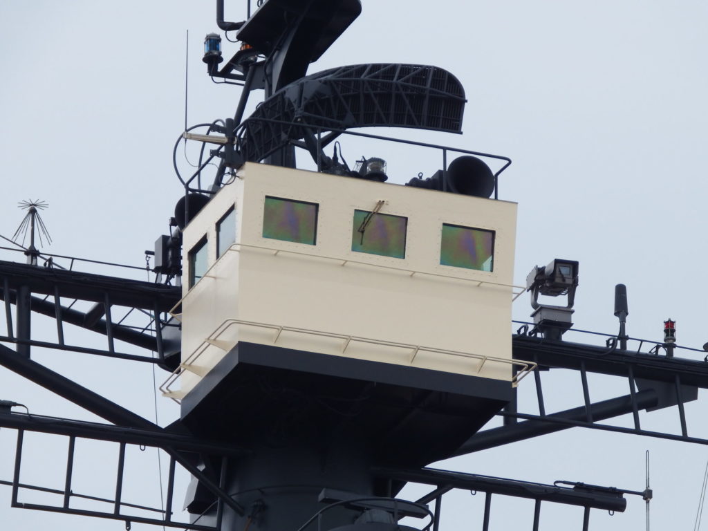 初代「しらせ」では、ここに操舵装置があり、氷海を高所から目視しながら操艦できたようですが、あまり利用しなかったためか、現「しらせ」では操舵装置が省略され、名称も「上部見張所」とされました。