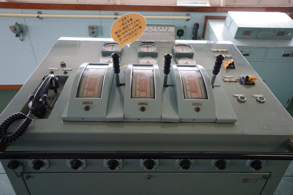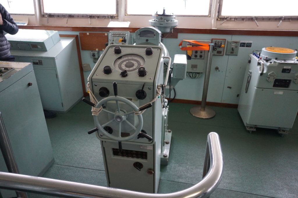 「SHIRASE 5002」は、もはや船舶ではなくなっていますが、機能はほとんど現役当時の状態のままだそうです。そのためスイッチ類には「触るな」の表示がしてあり、案内の方も「触らないで」と何度も言っておられました。
